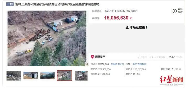 金矿业有限责任公司探矿权及房屋建筑等附属物在阿里资产拍卖平台被拍卖,本次拍卖经过931轮出价(包括922次延时出价),最终以1505.663万元的价格成交,对比起拍价255.663万元,溢价1250万元,溢价率达489%。