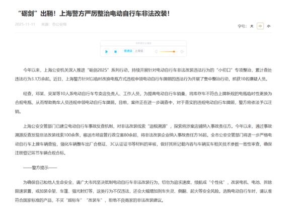 面对市场乱象,多地监管部门一直在持续加大整治力度。今年以来,北京市场监管部门已累计检查电动自行车经营主体2.2万余家次,查处电动自行车不合格及非法拼改装案件76件;上海公安机关深入推进“砺剑2025”系列行动,针对电动自行车非法改装违法行为开展“小切口”专项整治,累计查处违法行为3.1万余起,监管的“利刃”正变得越来越锋利,切实规范市场秩序。