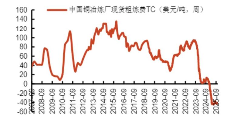 2025年,中国长单TC(粗炼费)已跌至历史低位,现货加工费甚至跌入负值区间,较此前高位降幅显著,意味着冶炼企业从矿商处采购铜精矿加工时,不仅拿不到加工费,还得倒贴钱给矿商。