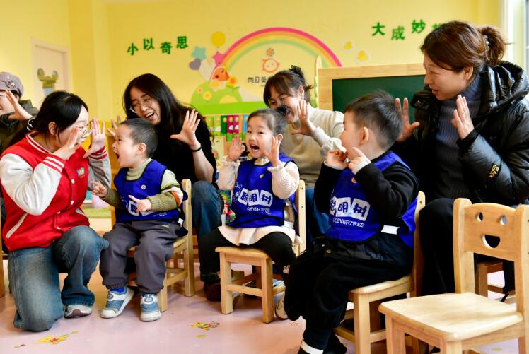 2025年2月20日,在山东省日照市东港区知子树托幼园,老师和家长在陪伴孩子做亲子游戏。新华社记者 郭绪雷 摄