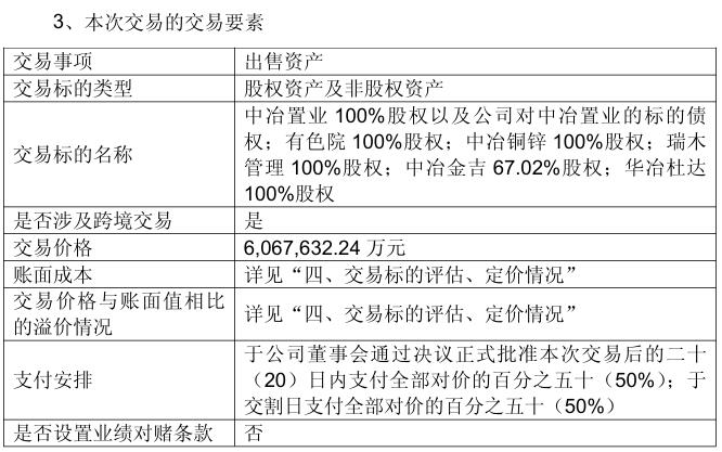金吉67.02%股权出售给中国五矿,公司控股子公司中国华冶拟将其持有的华冶杜达100%股权出售给中国五矿或其指定主体。本次交易为现金交易,交易价格约为607亿元。