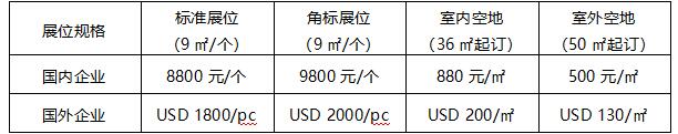 注:a.标准展位提供:三面围板、楣板制作、洽谈桌一张、折椅两把、射灯两只、10A插座一个。