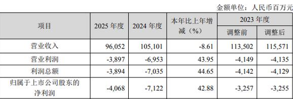 鞍钢股份公布2025年年度报告,报告期内,公司实现营业收入960.52亿元,同比下降8.61%;亏损40.68亿元。