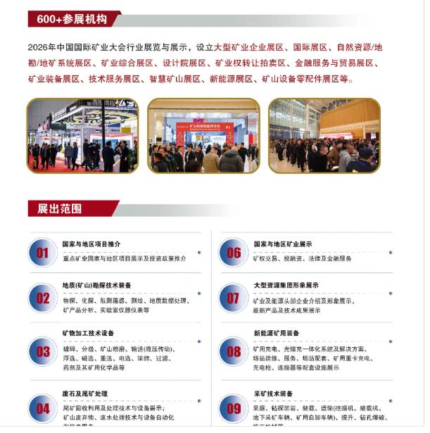 当前,全球矿业正处于绿色转型与技术创新的关键时期,机遇与挑战并存。中国国际矿业大会致力于为国内外矿业企业、科研院所、投资机构等搭建全方位的供需对接、技术研讨、资本合作、商贸洽谈平台。我们诚邀您以参会、参展、赞助等形式参与大会,与全球矿业同仁携手共进,共同推动矿业安全、绿色、低碳、智能、高效开发利用,为构建人类命运共同体的资源平台贡献力量。