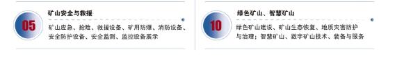 展览包含:大型矿业企业展区、国际展区、自然资源/地勘/地矿系统展区、矿业综合展区、设计院展区、矿业权转让拍卖区、金融服务与贸易展区矿业装备展区、技术服务展区、智慧矿山展区、新能源展区、矿山设备零配件展区等。