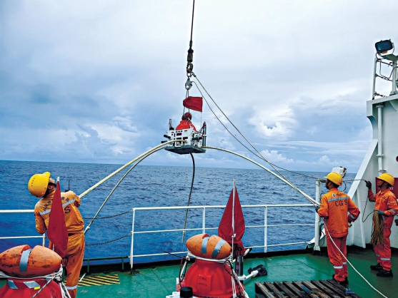 布放自主研发的全海深电磁采集站。广州海洋地质调查局供图