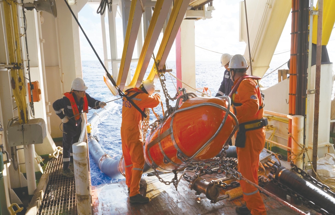 近日,中国地质调查局青岛海洋地质研究所“海洋地质九号”船首次穿越赤道、挺进南半球开展科考作业。图为船员正在布放气枪阵列。苏肖亮 杨源 摄影报道