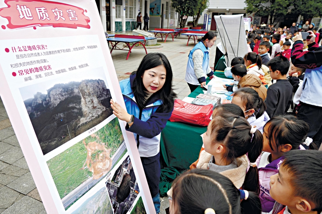 近日,广西壮族自治区自然资源厅组织开展“广西自然资源科普边境行”活动。图为百色市和那坡县自然资源局工作人员走进校园,向孩子们传授地灾防灾避险与自救技能。植小敏付宇佳 摄影报道