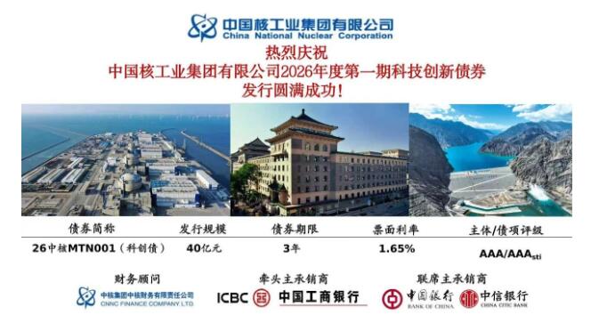 3月20日,中核集团成功发行40亿元科技创新债券,期限3年,票面利率1.65%,创下近期同期限、同评级、同行业债券市场融资利率最低水平,并刷新集团公司3年期债券发行利率历史新低。与同期限银行贷款相比,本次发行的债券存续期内可有效降低财务费用7,680万元,实现集团公司“十五五”债券融资“开门红”。