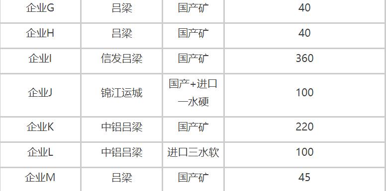企业F:该企业运行两条低温生产线,其中一条是近期刚投入生产的,满产,年产能120万吨左右,目前只用进口矿,主要来自于印尼,没有签长协船,一船一签,品位:Al:49%,SI:3.5%到4%,走天津港,黄骅港,该企业目前表示采暖影响持续进行,因之前供应紧张,现在正加紧补充库存。