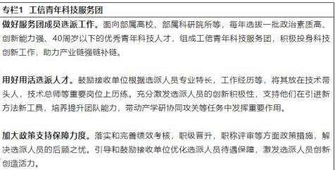 《意见》具体提出,要引导和支持政产学研等各方力量,着力培养一支政治素质高、创新活力强的青年科技人才队伍。组织实施工信青年科技服务团项目,引导优秀青年科技人才向重点企业流动。建立健全以信任为基础的青年科技人才支持机制,在重大项目资源分配等方面予以倾斜性支持,支持青年科技人才挑大梁、当主角。完善青年科技人才评价体系,加强和改进部系统高级职称评审工作,提高40周岁以下青年入选比例。提高部系统博士后流动(工作)站建设质量。