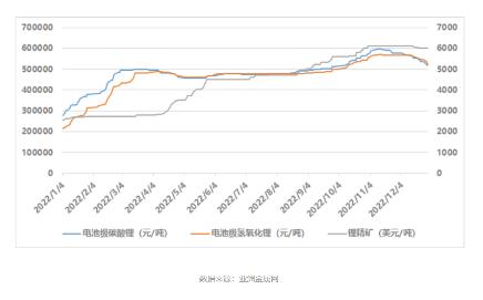 相关数据显示,2022年,电池级碳酸锂的价格由年初的27.75万元/吨上涨至年末的51.95万元/吨,电池级氢氧化锂的价格由年初的21.35万元/吨上涨至年末的52.05万元/吨。锂盐价格的上涨带动了上游锂精矿价格持续上涨,锂精矿价格由年初的2,560美元/吨上涨至年末的6,010美元/吨。