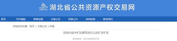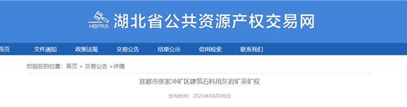 该矿位于宜昌市宜都市姚家店镇张家冲村和油榨坪村,距宜都市直距约9公里。矿区累计查明建筑石料用灰岩矿资源量为19982.3万吨,可采储量为18573.2万吨,生产规模900万吨/年,拟出让年限22.6年(含基建期2年),起拍价1.95亿元。此外,竞得人还需缴纳矿权出让前期相关费用、基础设施费用、确认竞买资格费用共计9.32亿元。网上挂牌时间2023年9月4日至2023年9月18日。