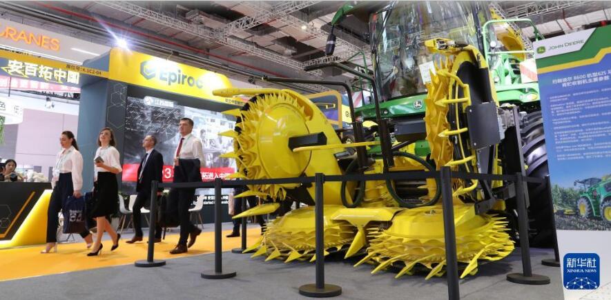 11月5日,参观者在第六届进博会上经过约翰迪尔公司推出的8600机型青贮收割机展品。