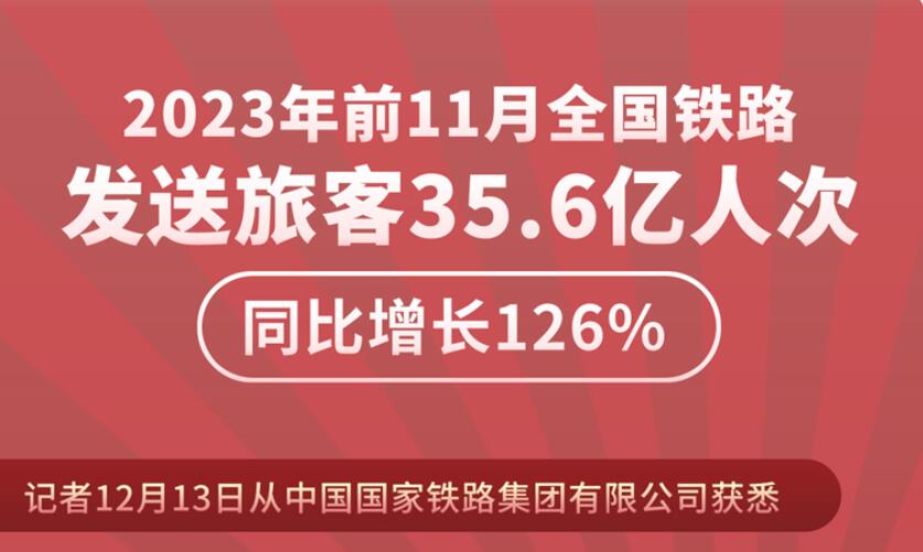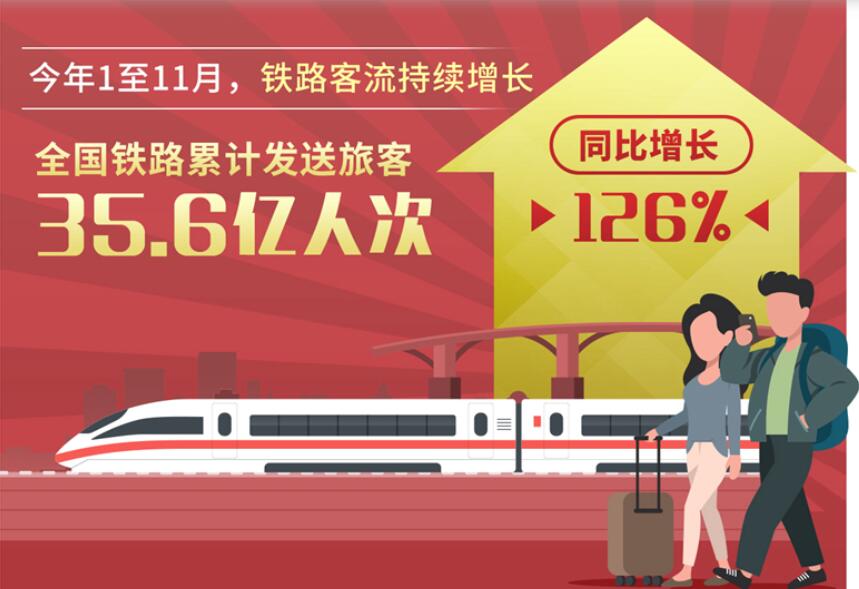新华社北京12月13日电(记者樊曦)记者13日从中国国家铁路集团有限公司获悉,今年1至11月,铁路客流持续增长,全国铁路累计发送旅客35.6亿人次,同比增长126%,单日旅客发送量、售票量等客运指标创历史新高,铁路运输安全平稳有序。