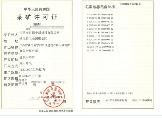 12月7日,江西交工矿业开发有限公司峡江县官洲矿区建筑石料用砂岩矿项目取得采矿权证。