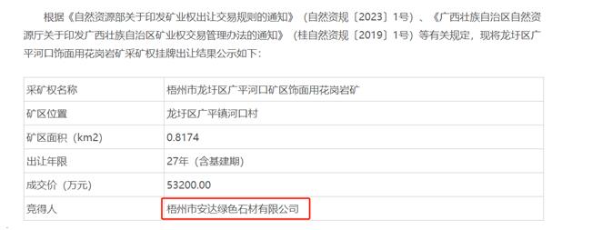 12月15日,梧州市安达绿色石材有限公司以5.32亿元成功竞得该项目矿权。据悉,该公司属当地国企。
