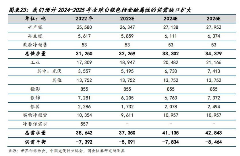 据悉,工业领域长期占据白银总需求的一半左右。近年来,随着全球新能源的蓬勃发展,光伏成为白银下游需求的重要增量。据国金证券测算数据,在光伏用银的带动下,2024 年 -2025 年,白银供需的缺口分别为 7834 吨、8464 吨。