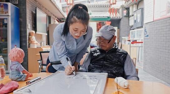 在北京市东四七条胡同一间老年公寓里,90后游波与一名有听力障碍的老人通过白板写字沟通。游波写下问题,老人一句句回应着。