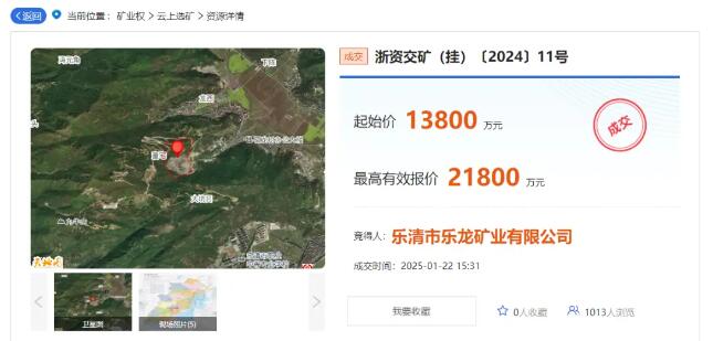 近日,浙江省乐清市城东街道龙兴村建筑用石料(凝灰岩)矿采矿权被乐清市乐龙矿业有限公司拍得,出让底价为13800万元,经历26轮次报价,溢价57.9%, 以21800万元成功 竞得。 该矿区范围内出让资源量共计1208.42万吨,年产310万吨,拟出让年限5年,单价约为18元/吨。