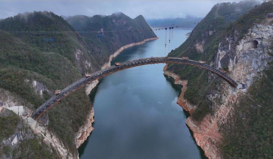 合龙后的乌江特大桥(3月5日摄,无人机照片)。 3月5日,贵州瓮马铁路南北延伸线项目控制性工程乌江特大桥顺利合龙。乌江特大桥全桥长约520米,主跨337米,桥面至江面高度约200米。 瓮马铁路南北延伸线北起瓮安延伸至遵义,南起马场坪延伸至都匀,全长148公里。 新华社记者 刘续 摄