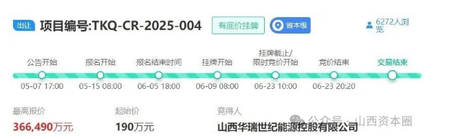 6月23日,山西省自然资源网上交易平台显示,山西省交口县李家山区块铝土矿探矿权挂牌转让公开竞拍“落槌”,山西华瑞世纪能源控股有限公司成为最终胜出者,竞拍价高达36.65亿元,成为又一斥重资在山西买矿的民企。