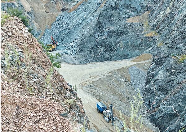 深坑开采点内有挖掘机、运矿车正在装车作业,附近还停放着一台专业凿岩台车