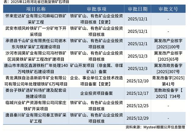 据Mysteel不完全统计,2025年12月河北省共批复铁矿石相关项目9个,分别是6个铁矿矿山、有色矿山企业投资项目核准或【变更】、1个矿山开发项目(非金属、非煤矿山)备案、1个企业、事业单位工业技术改造项目备案【变更】、1个企业投资项目备案。