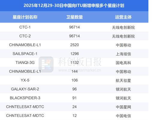 2025年最后一周,我国向ITU申报了多个卫星星座计划,申报总规模超20万颗。