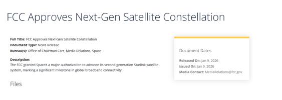 美国联邦通信委员会(FCC)批准下一代卫星星座计划,授权SpaceX在现有已部署8000颗卫星的基础上,增加部署运营7500颗Gen 2星链卫星。