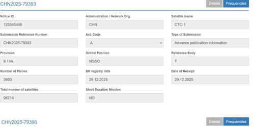 而在登记注册的前一天(12月29日),CTC-1和CTC-2这两个巨型卫星星座计划即以无线电创新院的名义向ITU提交了申请。