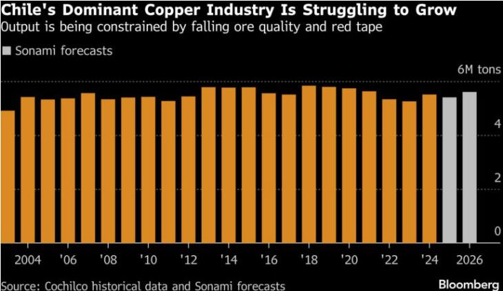 据该国采矿业组织称,智利作为全球最大的铜生产国,通过削减繁文缛节和放宽新政府的监管,有望摆脱二十年来产量停滞的局面。