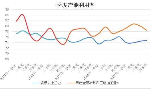 四季度黑色金属冶炼和压延加工业产能利用率78.5%,同比增加0.4个百分点,2025年全年产能利用率79.7%,同比增加1.6个百分点。