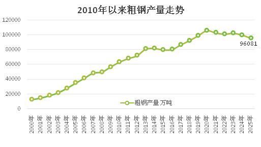 国家统计局数据显示:2025年12月,中国粗钢产量6818万吨,同比下降10.3%;生铁产量6072万吨,同比下降9.9%;钢材产量11531万吨,同比下降3.8%;焦炭产量4274万吨,同比增长1.9%。