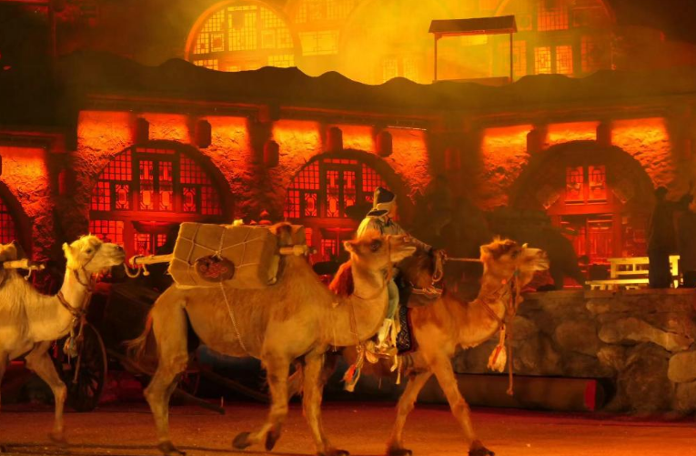 “出发喽!”随着驼夫号子响起,几峰驮着货物的骆驼从驿站前缓缓走过,后面跟着挑扁担的货郎和推小车的工匠。一支走西口的商队,从历史深处走来,走到莫尼山非遗小镇,为游客呈现了一场沉浸式实景剧《莫尼山礼赞》。
