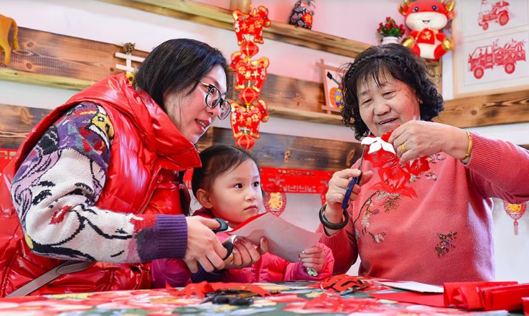 游客们在莫尼山非遗小镇体验剪纸。(呼和浩特市回民区融媒体中心供图)