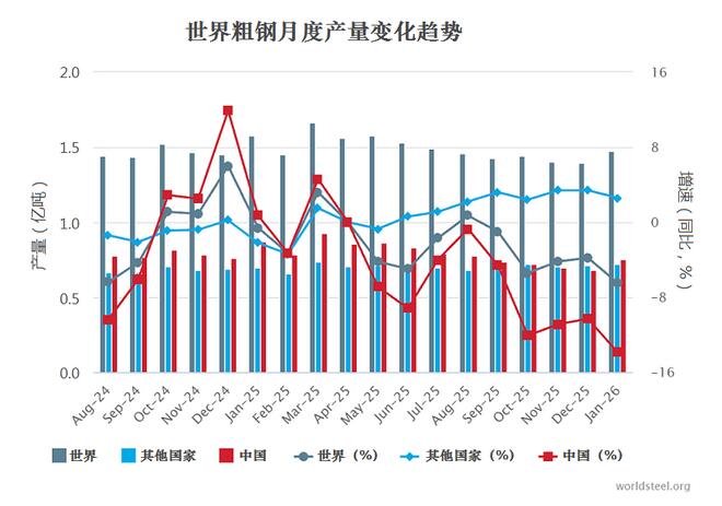 据世界钢铁协会统计,1月份,世界粗钢产量为1.47亿吨,同比下降6.5%。