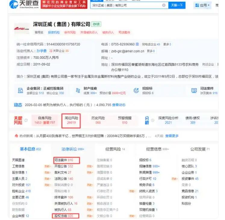 截至2026年2月下旬,深圳正威(集团)有限公司及其关联方持续新增多笔执行案件,单笔标的从数百元到数十万元不等。