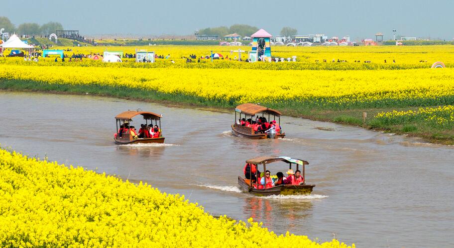 3月22日,游人在江苏省高邮市湖上花海景区游玩(无人机照片)。