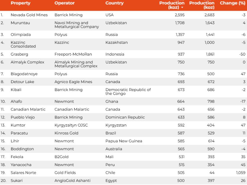 下面,我们将详细介绍全球各大金矿开采项目在本创纪录的产量年(以千盎司(koz)计)期间的表现: