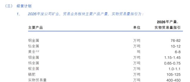 展望2026年,洛阳钼业各版块实物贸易量分别是:铜金属76万-82万吨、钴金属10万-12万吨、黄金6-8吨、钼金属1.15万-1.45万吨、钨金属0.65万-0.75万吨。