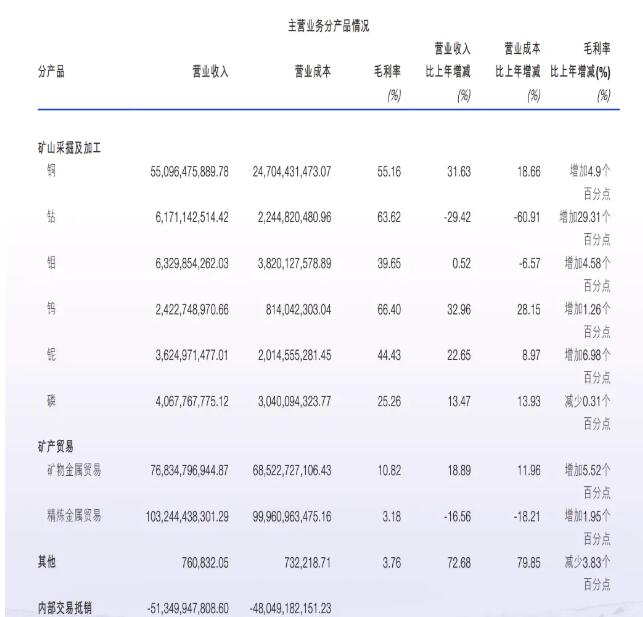 铜业务是该公司业绩增长的核心引擎。其去年铜产量达74.11万吨,同比增长13.99%。营收达到550.96亿元,占总营收的26.7%,占矿山端营业收入的71%。