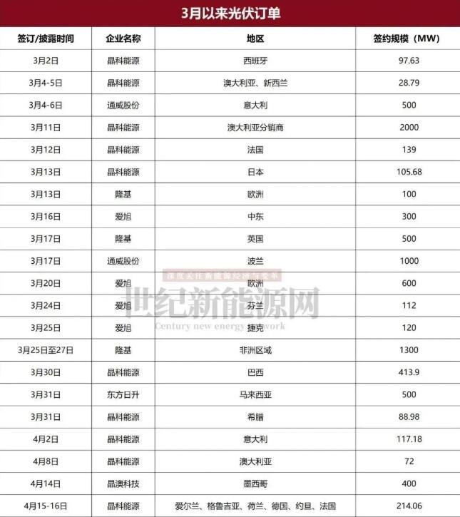 3月以来,晶科、隆基、通威、爱旭等多家中企接连宣布在海外获得光、储大单,其中不乏GW/GWh级订单。