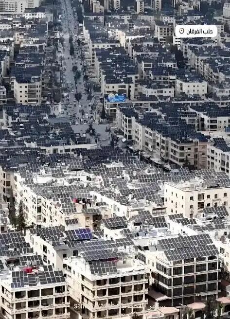 中国光伏产品此时成为救命稻草。叙利亚电视台近日发布的官方实拍画面显示,在阿勒颇古城,几乎每一栋民房屋顶都被深蓝色中国光伏板整齐覆盖,形成震撼的“光伏海洋”。