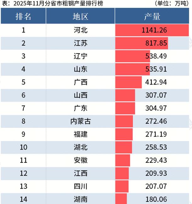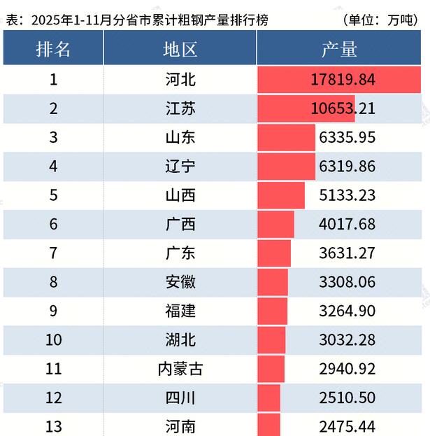 国家统计局数据显示,2025年11月中国粗钢产量6987.1 万吨,同比下降10.9%;1-11月累计粗钢产量89166.5 万吨,同比下降4.0%。 从分省市数据来看,2025年1-11月河北以产量17819.84万吨位列第一;江苏产量10653.21万吨排在第二;山东产量6335.95万吨排在第三。