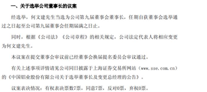 7、2025年2月24日,史志荣离任,中国铝业于2025年2月28日召开第八届董事会第三十一次会议,公司董事一致推举何文建从即日起至董事会选举产生新一任董事长期间代行公司董事长及法定代表人职责。2025年11月6日,何文建正式当选为公司董事长。