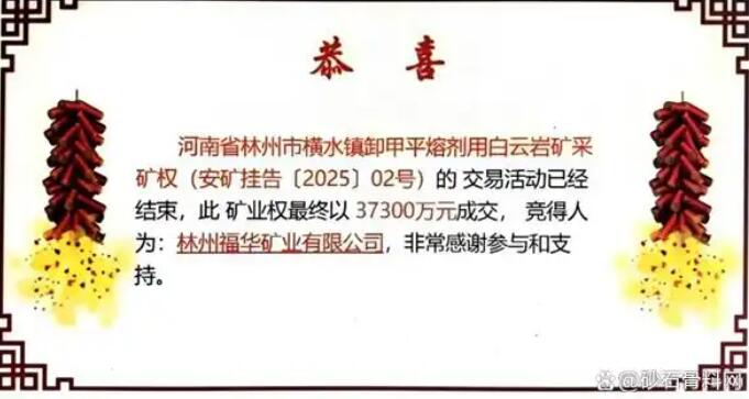 1月27日,根据河南安阳市公共资源交易中心矿业权交易系统信息获悉,林州福华矿业有限公司经323轮报价,以3.73亿元成功竞得林州市横水镇卸甲平熔剂用白云岩矿采矿权,溢价143.8%。该项目可采储量5045.50万吨,出让年限19年,开采规模300万吨/年,折合资源价款7.39元/吨。