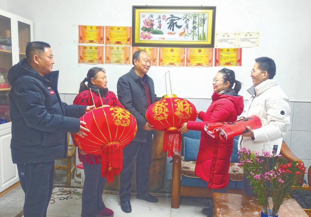 图为城西自然资源和规划所工作人员将大红灯笼和春联送到搬迁户刘甘华家。洪曙光摄