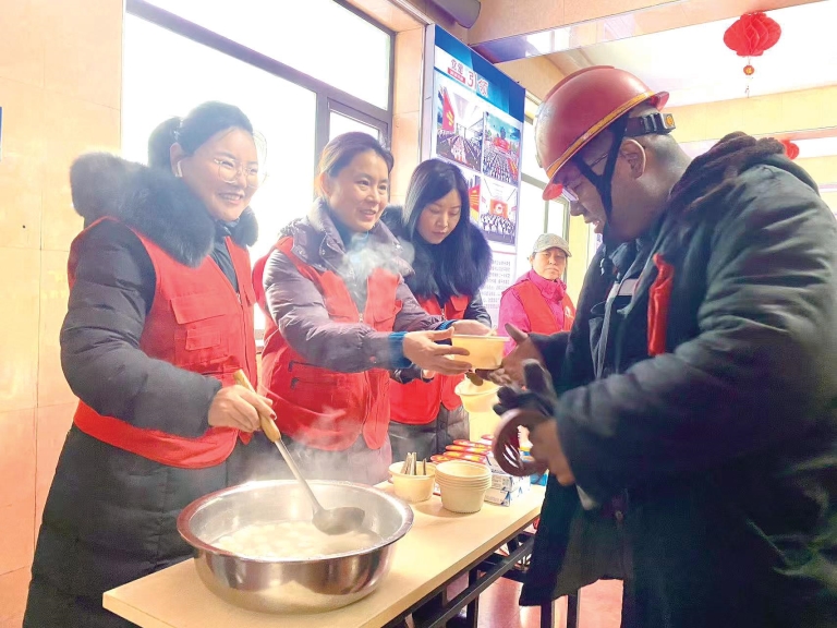 3月3日,华阳集团二矿在井口开展“迎元宵・送温暖”活动,女工家属协管员将一碗碗热气腾腾的汤圆送到刚升井的职工手中,叮嘱大家注意安全,并向他们送上元宵佳节的问候。图为活动现场。任锁生摄