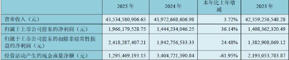 锡业股份(SZ000960,股价32.50元,市值534.77亿元)3月29日晚间披露2025年年报,公司2025年实现营收435.35亿元,同比增长3.72%;实现归属于上市公司股东的净利润19.66亿元,同比增长36.14%;实现扣非净利润约24.18亿元,同比增长24.48%;基本每股收益1.1561元。公司拟每10股派发现金2.5元,不送红股。